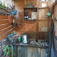 - Outdoor washing area ala Indian shower (bucket cup for watering)