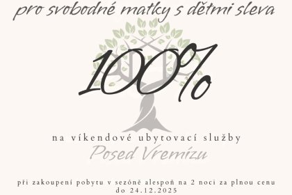 I my jsme chtěli před Vánocemi udělat dobrý skutek, a proto jsme se rozhodli, že všichni, kdo si od tohoto okamžiku až do půlnoci 24. 12. 2025 zakoupí pobyt v sezóně alespoň na dvě noci za plnou cenu – a to buď v libovolném volném termínu, nebo formou poukazu bez stanoveného data – obdrží od nás zároveň poukaz se 100% slevou na víkendové ubytování pro svobodné matky s dětmi.